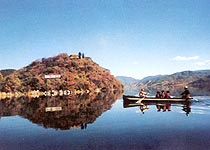 从“摩梭山庄”乘独木舟,15分钟可到,从“摩梭之家”骑马或步行,约3小时可到,沿湖边走一走,可以欣赏泸沽湖的湖光山色。