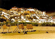 从中甸县需向北望去,在宽阔的草原尽头,群山之间,有一座集镇规模的建筑群,极高处的屋顶上有鎏金铜瓦熠熠放光,夺人眼目。这片近乎古堡群似的建筑,就是松赞林寺。