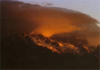 卡格博峰下,水斗、冰川连绵。其中“明永恰”和“斯恰”如两条银鳞玉甲的长龙,从海拔5500米往下伸迁至2700米森林地带,离澜沧江面仅800多米,是世界稀有的低纬度、高海拔季风海洋性现代冰川。