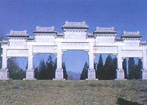 明十三陵位于北京市昌平县境内天寿山南麓,区域面积达40余平方公里。明朝迁都北京后,有十三位皇帝埋葬在此,故称十三陵。陵区周围群山环抱,中部为平原,陵前有小河曲折蜿延,十三座皇陵均依山而筑,分别建在东、西、北三面的山麓上,形成了体系完整、规模宏大、气势磅礴的陵寝建筑群。