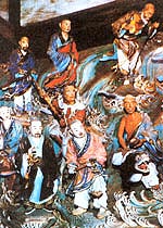除了单个的罗汉之外,雕塑家还设计了一组组互有关联的人物。如一位头顶风巾,身披袈裟,手执大节龙头竹杖的罗汉,正张着宽阔厚实的嘴,板着手指,凑近同伴,似在低声细语,诉说人世沧桑;而他的同伴,手捧法器,侧耳倾听,惊讶、同情、深思,各种复杂的感情集于一脸,似乎窥见他心灵的震颤。