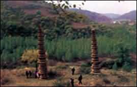 华池县双塔寺遗址及双塔简介 双塔寺遗址和石造像塔位于华池县林镇乡张岔村双塔沟和豹子川河交汇处的台地上,寺院和两座石造像塔始建于金正隆至大定年间(1156--1189),筹建人有寺院主持僧普恩、德敬和保义校尉,华池寨主李世雄等人,当时名为"石塔院",后于大安年间又更名为"兴教院"。这是一处佛教寺院。寺院历元、明至清乾隆年间废弃。现存寺院遗址主要有"三圣殿"、"三门殿"、"伽蓝殿"、"双音阁"、"钟楼"等建筑的残墙与基础及两座造像塔。造像塔通体遍雕佛、菩萨、弟子、供养人,伎乐天等造像,还有涅槃等本生故事,全塔造像多达3600余身;二号塔造像较少,全塔615身,塔高13层11.98米。双塔造型秀丽,结构严谨,雕凿细腻,充分显示了我国古代无名工匠精湛的工艺技巧和完善的艺术造型,凝聚了古代劳动人民智慧和艺术的结晶,具有很高的历史,科学和艺术价值。 2000年5月至7月间对寺院遗址进行了抢救性发掘,出土了石碑、经幢、陶石建筑构件等文物370多件,标本267件,尤其是许多珍贵的文字铭刻,记录了寺院的名称、始建年代和筹建人等。1963年2月、1981年9月两次经省人民政府审定,公布为省级文物保护单位。