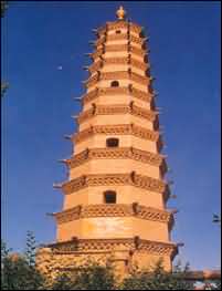 罗什寺塔矗立在武威市北大街,是为了纪念西域高僧鸠摩罗什在武威弘扬佛法、翻译经典的功绩而建造的。罗什寺塔最早建于后凉(386-403),塔及寺院在唐时大力扩建,明、清皆有修葺。其间于明代成为陕西凉州大寺院,英宗正统十年二月十五日,为罗什寺院颁发了大藏经,并下圣谕道:“刊印大藏经,颁赐天下,用广流传,兹以一藏,安置陕西凉州大寺院,永充供养。”此谕现完好保存于武威市博物馆。1934年,罗什寺塔被重修。鸠摩罗什的祖先是印度人,出身于世代相国之家,罗什于344年生于新疆库车。他少时智力超群,聪颖过人,因之被称为“鸠摩罗什”,意思是“神童”。7岁时当了和尚,12岁游历西域诸佛教国,以精于佛学闻名。吕光在383年破龟兹,征服了西域30余国,得鸠摩罗什和2万多峰骆驼,载着西域的珍宝、文物而归。386年,吕光回到凉州,建立了后凉国,定都姑藏。从此,鸠摩罗什就住在武威,讲经说法,传播佛教达十七八年之久。401年,姚苌之子后秦国王姚兴灭后凉国,迎鸠摩罗什到长安,尊为国师,奉之如神,让罗什住在陕西草堂寺译经讲法,他临死时说:“所译经典,要是没有违背原意的地方,死后焚身舌不烂。”409年8月12日,罗什死于长安,享年70岁。相传,武威罗什寺塔就是根据罗什遗嘱,埋葬他不烂之舌之处。现存罗什寺塔八角十二层,高32米,全以条形方砖砌成。从下起第三、五、八层均设门,顶部是葫芦形的铜质宝瓶,最上层东西各有小佛龛,龛内有佛像。 巍然屹立的罗什寺塔,象征着武威古城悠久而文明的历史,也是1500多年前丝绸之路上中西文化交流的见证。
