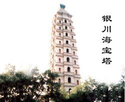 在银川市北郊,距城垣1.5公里,寺借塔名,俗称北塔。海宝塔始建年代不详,据史载为赫连勃勃(大夏国王,公元407-427年)重修,故此塔又称赫宝塔。 寺院的中轴线上,自东向西建有山门,天王殿,钟、鼓楼,大雄宝殿,韦陀殿,卧佛殿等殿宇。海宝塔耸立于大雄宝殿和韦陀殿之间。是一座典型的佛教寺院。殿内佛像栩栩如生,香烟袅袅,晨钟暮鼓,僧诵阵阵。高大的卧佛殿内塑有释迦牟尼佛的涅媻像,全身长达7.6米,形态端庄,令人起敬。后立迦叶、阿难等十大弟子像,五色彩绘,各具神态,表现释迦牟尼临终前向弟子们嘱托后事的情景。 海宝塔是寺院的主要建筑,系楼阁式9层11级砖砌方形塔,总高53.9米,造型独特别致,每层四面置券门,券门的两侧设凹檐。塔刹是绿色琉璃桃形四角攒尖刹顶。因券门部分皆向外突出,外观塔身形似“亚”字。为我国众多古塔所罕见。塔室为方形空间,以木梁楼板相隔,缘木梯攀登154级可达顶层。游人眺缆山河,俯瞰四视,可见西边巍巍贺兰山,恰似奔腾的骏马;东方的古老黄河,犹如飞舞的巨龙;山河之间,银川平原一望无垠,沟渠如网,稻田连片,一派江南景色。