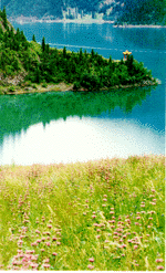 山中的春天姗姗来迟,当春风吹到天池湖畔的时候,山外的绿洲已是花期鼎盛、杨柳飘绵了。天池春色是百灵鸟唱出来的。冬来的积雪消融后,复苏的青草赶紧为湖畔披上新绿,草从中那些雪白的、红的和金黄的无名小花,装点出一