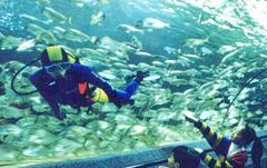 大连圣亚海洋世界是中国第一座海底通道水族馆,放养海洋动物200余种、10000余只,它拥有长达118米的海底通道,10000平方米的珊瑚鱼展厅,并设有舰船展厅、儿童活动(涂鸦)室,镭射放映厅、西式快餐厅、海洋礼品商店等功能区。