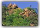 千山位于鞍山市东南20公里,是全国著名的风景区之一,在东北境 内,与吉林的长白山齐名,有“东北明珠”之称。据说,此山层峦起伏, 大小山峰近千,故名千山。 千山风景区的范围大约44平方公里,最高峰仙人台海拔708米。整 个风景区按地形分为北、中、南、西四个游览区。 千山开发较早,自隋唐开始,山上就有建筑物,主要是寺庙。到辽、 金时,寺庙建筑已具规模。明、清又相继兴建了不少寺庙,其中著名的 有祖越寺、龙泉寺、大安寺、中会寺、香岩寺,称五大禅林。千山寺庙 建筑的特点的凭山建庙,山庙一体,山中有寺,寺外环山。五大禅林中 最大的是龙泉地坐落在北沟中部丛林中,现存主要建筑有大雄宝殿、天 王殿、韦驮殿、毗卢殿、龙王庙等十七幢庙舍。 无量观,规模最大。清康熙六年建。观内有19幢建筑,周围有“聚 仙台”、“葛公塔”、“八步紧”、“一步登天”、“天上天”、“罗 汉洞”等景点。“一步登天”是一处陡壁,壁上按有铁环,游人手拉铁 环,足登石壁,一跃而上,登上岩顶,到达“天上天”,因此叫“一步 登天”。 千山有许多形状怪异的石峰,向有“无峰不奇,无石不峭,无寺不 古”的美誉。千山最高峰仙人台,有一长约30米,宽4米的石台,四周 设有铁栏,游人凭栏远眺,可观赏千山全景,远处的钢都鞍山,也历历 在目。 千山胜景,吸引了历代的文人学士,因此山上石崖题,碑文塔记, 匾额楹联,不可胜数。相传唐太宗李世民曾游此山。清康熙、乾隆皇帝 也曾多次来游.