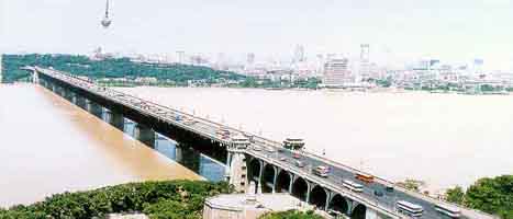 武汉长江大桥于1957年10月15日建成并通车,它是连接长江南北的第一座大桥。大桥分两层,上层公路,面宽18米,4车道;下层铁路,全长1670米。其中正桥长1156米,汉阳岸引桥长303米,武昌岸引桥长211米,正桥有2座桥台,8墩9孔,每孔跨度128米。