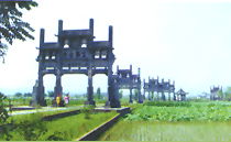 棠樾古村位于黄山南麓,国家历史文化名城歙县古城西郊,为鲍氏家旅聚居之地。清乾隆帝南巡时曾题联赞叹:“慈孝天下无双里衮绣江南第一乡。村内七座牌坊逶迤成群,古朴典型雅,明建三座,清建四座,按忠孝节义顺序排列。每一座牌坊都叙说着一个血泪交织的动人故事。古牌坊周围伴以古祠堂、古民居、古亭居、古亭阁、在广阔的田园风光、秀丽的山光水色映照下,一幅气势恢宏的“徽州古建三绝图“深然天成”。近年来,棠樾牌坊群已成为天然的影视基地、《红楼梦》,《烟锁唐楼》等三十多部影视名剧在此拍摄,现在,它已成为饮誉中外的高文化品位的旅游景点。人们赞叹“棠樾牌坊、天下无双!”