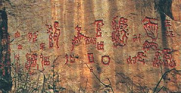 古迹显现于赭红色的崖壁之上,因年代久远,风雨侵蚀,游人涂沫,已模糊不清,更添神秘莫测之感。是一组若字若图,非镌非刻,非阴非阳,竖不成行,横不成列,大小不一,结构奇特,笔划古拙难辨的赭红色遗迹。
