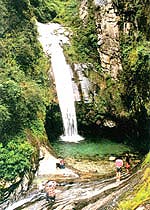 清碧溪 苍山十八溪之一,在马龙峰与圣应峰之间。从大理古城南七里桥的圣麓公园沿溪而上,穿峡进谷之后,即可见到在岩壑涧,一股清泉从几丈高的悬崖峭壁上飞泻而下,依次形成上、中、下三潭,这就是闻名遐迩的清碧溪。自唐宋以来,多有名人游览呤咏记入史籍。明代状元杨慎在《游点苍山记》一文中记述说:“西南有一溪,叠堮承流,水色莹澈,其中石子粼粼,青碧璀璨,宛如宝玉之丽,其名曰清碧溪。”明代大理著名文人李元阳在《清碧溪三潭记》中也作了真切的记载:“源出山下石间,涌沸为潭,深丈许,明莹不可藏针。小石布底累累如卵如珠,青绿白黑,丽于宝石,错如霞绮。”明代大旅行家和地理学家徐霞客考察过清碧溪后,在游记中则称清碧溪:“其色纯绿,漾光浮黛,照耀崖谷,午日射其中,金碧交荡,光怪得未曾有。”明代《大理府志》则有:“峪有三盆,涧水三叠,盆中水清石丽,翠碧交加”的记载。千百年来,清碧溪使多少文人墨客为之醉倒,为之呤咏讴歌。