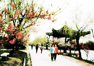 瘦西湖入口处至小金山的一条长堤,遍栽夭桃绿柳,每当春色撩人的季节,依依柳色映衬一片姹紫嫣红,灿若云锦,使人留连。