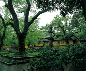 法雨寺为普陀山三大寺之一,也称后寺。明万历八年(1580年)僧人大智真融始建,初名海潮庵,后改称海潮寺、护国镇海禅寺。清康熙三十八年(1699年)兴建大殿时,赐“天花法雨”额,因改名法雨寺。现寺宇庞大,有天王殿、玉佛殿、九龙观音殿、御碑殿、大雄宝殿、方丈殿、印光法师纪念堂等。其中以九龙观音殿建筑最为辉煌,殿中“九龙盘拱”等建筑系康熙时由金陵(南京)明旧宫九老殿迁移于此,甚为珍贵,殿分7间,深5间,琉璃顶,内槽九龙藻井,一龙盘顶,八龙环八柱昂首飞舞而下,正中琉璃灯宛若一颗明珠,组成九龙抢珠图案。印光法师纪念堂为纪念近代高僧印光大师而设,他在法雨寺潜心著述40年,文章风行全国,被推为“净土宗第13代祖师”。1983年法雨寺被国务院列为首批对外开放的全国重点寺庙之一。