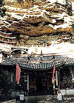 宝相寺又名石宝寺,因建筑奇险,被誉为“云南的悬空寺”。为明正统年间鹤庆土知府高论所建,初为道观,后来佛教兴盛,除玉皇阁外,大多庙宇均祭佛像,成为一个佛道合流的场所。寺建在佛顶山高耸险峻的悬崖上,令人目眩,寺坐西朝东,进山门而至天王殿,大雄宝殿均层层升高,弥勒殿与玉皇阁则凌空建造在崖内,需从左右攀岩扶壁方能到达。