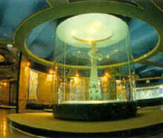 广汉三星堆博物馆位于广汉城西11公里处的三星村,这里发掘的大量古蜀国生产工具、生活用具、玉石礼器、陶器及其加工作坊、古城墙、住宅遗址等,说明这里曾是古蜀国都城,并已被列入我国古代五大商城之一。特别是1986年7月至9月发掘的两座大型商代祭祀坑,出土了金、铜、玉、石、陶、贝、骨等珍贵文物近千件。其中最让人吃惊的是金杖、大铜人立像、大型人面具和青铜神树。金杖长142厘米,重780克,全用纯金皮包卷而成。杖上刻有人像高181厘米,座基79厘米,总高度达260厘米,重约300余斤。它是当今世界上出土年代最早、体型最大的一件青铜器。青铜神树高350厘米,树上挂有许多飞禽走兽、铃和各种果实,是古代巫师们专用的神器。另外还出土有青铜头像40余种,面具10余件。