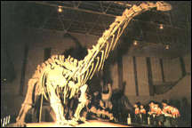 第二部分 主要介绍大山铺的各类恐龙化石。它们陈列在高大宽敞的装架厅里,这里有几副完整的恐龙化石骨架,其中“天府峨嵋龙”是该厅最引人注目的庞然大物。它的头被细长的颈支的老高,离地面约10米,全身长约20米,躯体粗大,尾巴很长,四脚着地,昂首挺立。大厅里除了“天府峨嵋龙”之外,还是一具凶猛的能食“天府峨嵋龙”的“建设气龙”的骨架,但它全身长仅四五米。其他还有进步性与原始性相兼地蜥脚类恐龙-李氏蜀龙,身躯细小,两足行走的鸟脚类恐龙-多齿盐都龙,早期的比较原始的剑龙-太白华阳龙,空中飞翔的龙和遨游水中的凶猛肉食性蛇颈龙等等。