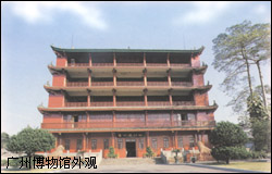 广州博物馆馆址镇海楼,始建于明洪武十三年(1380),距今已有六百多年的历史。楼高28米,宽31米,深16米,红墙绿瓦,雄伟壮丽,是广州著名的古建筑。明初,永嘉侯朱亮祖大兴土木修缮广州城,合宋代三城为一,在城东北山麓拓展北城八百余丈,城垣由东而西,逶迤横跨于越秀山上,并在城高处建楼以壮观瞻。因粤地临海,故名镇海,以示“雄镇海疆”之意。又由于当时珠江江面辽阔,登楼东望,珠水滔滔,万顷碧波,故又有望海楼之名。楼分五层,逐层收减,似塔又似楼,稳重庄肃,俗称五层楼。其时登楼眺望,珠水云山,群峰叠翠,羊城景色,历历在目,被誉为“五岭以南第一楼”。数百年来,诗人墨客咏叹之篇不绝。清代著名诗人屈大均在《广东新语》中写道:“横波涛而不流,出青冥以独立,其玮丽雄特,虽黄鹤、岳阳,莫能过之”。“镇海层楼”和“越秀层楼”分别是清代和现代羊城八景之一。1996年又评为广州十大旅游美景之一。
