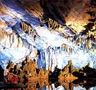 桂林市西北郊的光明山,外表看去并不奇特,在它南侧山腰上有一个洞口,两旁生长着可以做成笛子的芦草,当地人称之为芦笛洞。这是一个雄奇瑰丽的岩溶洞穴,迄今已有60多万年的历史。洞内有大量的石乳、石笋、石柱、石幔和石花,组成了各种优美的景物,如狮岭朝霞、石乳罗帐、原始森林、云台揽胜、盘龙宝塔、帘外云山、远望山城、幽景听笛等等,被人赞为“大自然艺术宫”。它的洞深有240米,因曲折有致,游程约500米。1962年著名作家邓拓游完芦笛岩后写道:“乍看这个洞口又矮又小,似乎是很平常的岩穴,但是,一走进洞里,印象马上大变。满目琳琅的红、绿、黄、白各种颜色的钟乳石,构成了这个神话世界的万般奇景。整个岩洞分为两个部分,也可以叫做前洞和后洞。前洞是一组又深又大的由马蹄形通道联成的洞穴;后洞则是一个宽广深邃的大岩。在前后洞衔接的地方,有一个水潭,把岩洞分成两个部分,中间乱石堵塞,还要经过一番修理,才能顺利通行。芦笛岩的钟乳石,分外鲜艳玲珑,光辉耀眼,处处都是五彩缤纷、如花似锦。红的如珊瑚,绿的如翡翠,黄的如琥珀,白的如玉石。整个洞府好像全部是用宝石、珠翠、珊瑚、象牙、绸缎和脂粉堆积起来的,简直和神话传说中的阆苑仙宫一样。......我自己好像真的做了一场美梦,永远不能忘记这神话世界的迷人景色。”芦笛岩在1000多年前就有人游览了,洞内迄今仍保存着唐宋以来的壁书77则,大部分是墨笔所写,字迹仍可辨认。元明以后此洞成为当地人民躲灾避难之所,洞口被堵,少为人知。明末地理学家徐霞客来桂林考察时,游遍了桂林城东各洞及名胜,却没有涉足于桂林的城西北。直到1959年,芦笛岩才被政府开发,1962年正式向游人开放,成为桂林的一大名景,被称为“芦笛仙宫”。