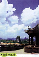 独秀峰位于市中心的古王城里,它得名于南北朝诗人颜延之的“未若独秀者,峨峨郛邑间”的诗句。它孤峰平地拔起,巍然屹立,陡峭高峻,气势雄伟,被赞誉为“南天一柱”,与叠彩山、伏波山三足鼎立于市内。从正面看,独秀峰巍峨端庄;从侧面看,却峭拔挺秀。在朝阳和晚霞的照耀下,它好像披上紫袍金带的王者,所以又称为紫金山。山的西麓有一条蜿曲而上,共306级的石磴道,直通峰顶。山道转折形成乐山、探奇、瞻云之景,其间还有“螺磴穿云”、“昆仑天柱立”等题刻。从峰顶极目,全城秀色,尽收眼底。独秀峰虽然孤峰独立,但奇洞不少。其中最著名的是东麓的读书岩,它像一间石室,内有天然的石窗、石榻。颜延之当年在桂林当太守时,府治就在独秀峰的东面,因而经常到此处读书。山的西麓还有一洞,叫太平岩。北麓有泉,名“廉泉”,亦名“独秀”,明靖江王因泉凿地为池,形似月牙,又叫它作月牙池。独秀峰在古代就是桂林著名的风景点,被称作“独秀奇峰”。清代诗人袁枚写诗赞道:“来龙去脉绝无有,突然一峰插南斗。桂林山形奇八九,独秀峰尤冠其首。”