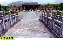 靖江王陵位于尧山的西南麓,是明太祖朱元璋重孙靖江王朱守谦及其历代子孙的陵园。除第一代靖江王朱守廉和末代的朱亨嘉、朱亨鄄外,其余十一代靖江王均葬于此。在方圆100余平方公里内,有王、妃及宗室墓共300余座,是全国保存得比较完整的明代藩王墓群。每座王墓有内外两道围墙,封土硕大,墓前有享堂和碑亭,两旁陈列高大有石人、华表以及虎、狮、羊、象、麒麟等石兽,雕刻精湛,古朴深厚,值得观赏。游人可重点游览第三代庄简王朱佐敬与王妃之合葬墓。登上墓顶,可俯瞰整个陵园,苍松翠柏与红墙朱殿交相辉映,非常壮观。