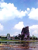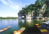 象鼻山,又称象山。明代诗人孔镛写道:“象鼻分明饮玉河,西风一吸水应波。青山自是饶奇骨,白日相看不厌多。”这一百看不厌的象鼻山位于城南璃江和桃花江的江流汇合处。山形酷似一头巨象,伸长鼻子临江吸水,因而得名。象鼻与象身之间的大洞,便是著名的水月洞。范成大说它“其形正圆,望之端整如月轮”。水月洞里江水通流,可泛小舟,在明月之夜,它的倒映则构成“水底有明月,水上明月浮”的“象山水月”奇观,而使历代诗人吟咏不止。洞内外崖有古代石刻文物50余件,其中以宋代爱国诗人张孝祥、范成大和陆游的作品最为有名。陆游虽然没有到过桂林,但对这里的奇山秀水神往不已。他把诗和信札寄给当时任昭州(今广西桂林市平乐县)太守的朋友杜思恭。杜思恭则“命工刻于崖石,与世人共之”。象鼻山的山脚有石级小路通上山顶。山顶平展,绿树成荫,当年太平军在此架炮攻城。在山顶的东端有明代的实心砖塔,因嵌有普贤菩萨像而得名普贤塔。塔身好似圆形宝瓶,又像剑柄,又有人称之为瓶塔或剑柄塔。象鼻山的南麓有近年改建的始创于唐代的云峰寺,寺内陈列着太平天国的历史文物。在寺的西面是一座舍利塔,这里原来还有个开元寺。唐代的鉴真和尚第五次东渡日本失败,漂到海南岛,在北归的途中,经过桂林时,居住于开元寺,在此主持大典,讲法传经。可惜古寺早废,只留下这座佛塔叙说当年盛事。象鼻山,景色优美,是桂林山水的象征和桂林城的标志,最令中外游人喜爱。
