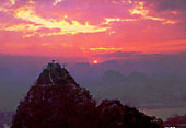 距伏波山只有千米之遥的是叠彩山,它位于桂林市北的漓江之畔,包括四望山、于越山和明月、仙鹤两座山峰。因山石层层横断,如彩绸锦缎相叠,故而得名,古代山上多桂树而称之桂山,又由于山中有个四季生风的洞,也叫它作风洞山。山的南麓有登山古道,拾级而上数十步即可到达叠彩亭。亭东的小山就是于越山,山顶有于越亭,从亭中眺望明月峰的山石,便见叠彩层层,琳琅满目,最能领略“叠彩”之意。叠彩亭西是四望山,四望山的西北侧则为仙鹤峰,仙鹤洞从山腹东西贯穿。叠彩山的主峰是明月峰。走过山腰的叠彩门,便可见到“成仁碑”和“仰止堂”。明末大臣瞿式耜和张同敞在桂林抗清被俘,至死不降,就义于此,留下了他们的唱和诗《浩气吟》。过了“仰止堂”,就可以感到阵阵清风从风洞里扑面而来。风洞略似葫芦形状,前后开敞,中间狭小,南北对穿,终年凉风习习,古人因而写下了“洞锁烟霞六月寒”的佳句。穿过风洞就是叠彩楼,此处明朗开阔,便于观景,有“江山会景处”的美称。出叠彩楼依山右行至望江亭,再向上攀登,就可以到达明月峰顶的拿云亭。此处是五代时楚王马崇所建马王台遗址。1963年春,朱德和徐特立以80高龄,健步登山拿云亭,写有“登高不用杖,脱帽喜东风”和“拿云亭上望,漓水来春风”的唱和诗句。游人立于拿云亭,向上好像能摘星揽月,摩天拿云;向下可以俯瞰漓江,蜿蜒南去;远望群山峻岭,秀丽奇特;近看桂林全城,尽收眼底,这里是桂林揽胜赏景的最佳处。唐代以来,叠彩山就是旅游胜地,历代留下很多诗文题刻。其中以唐代元晦、宋代朱希颜、明代刘台、清代袁枚等人的作品最为有名。清末康有为来桂林讲学时,就住在风洞前的景风阁,留下了“康岩”“素洞”等题刻,以及“努力崇明德,随时爱景光”的手书对联。第二年,他在北京为变法图强而发起著名的“公车上书”,在签名的各省举人中,以广西的人数最多。