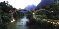 龙虎山在隆安县境内,距县城35公里,离南宁有92公里的路程。风景区有97.2%被原始森林覆盖着,幽深而神秘,渌水江就像一条绿色的飘带蜿蜒其间,江水清澈平静,鱼虾历历在目。江的两岸群峰叠翠,古木参天。这片原始森林约有8.6平方公里,生长着1100多种植物和上百种动物,有不少珍稀植物和国家一、二类保护动物,“茶族皇后”金花茶在这里有适宜的生长条件,连片成林,争研斗奇。龙虎山还有一座座宛如巨型盆景的石林,一个个千姿百态的溶洞。当然,最具龙虎山旅游特色的,也是最惊险刺激的就是观猴了。 广西是著名的猴乡,但城里人也只有在动物园才能看到猴子。但在龙虎山,人们可直接与野生的猴子玩耍。龙虎山既无老虎,更无神出鬼没龙,有的只是成群结队的猴子。俗话说山中无老虎,猴子当大王。峨眉山也是著名的观猴区,但据说那里的猴子十分顽劣,经常干些“打家劫舍”的勾当,游客的照相机什么的也敢抢。比较起来,龙虎山的猴子就显得规矩多了。它们也顽皮捣蛋,比如游客过铁索桥时它们在另一边拼命摇晃,等等,但它们一般不抢游客的东西,只是远远地等着游客抛食物给它们吃,大胆的游客尽可以前去逗弄它们,与它们合影留念。