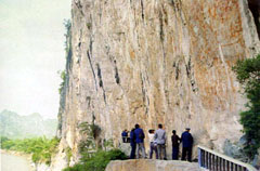 花山崖壁画(必游) 壁画,也称岩画,就是刻画在山洞壁上和山崖上的图画,最早是在欧洲发现的,它的创作时间大都是在旧石器时代后期到铁器时代早期,内容多是狩猎、野兽、家禽等,它们是人类祖先生活情景和思想智慧的反映,是研究一个民族发生发展的重要依据,有着非常珍贵的价值。花山壁画的发现,填补了我国无岩画的空白。 花山,位于宁明县驮龙镇的左江岸边,距县城约25公里。在它那临江的一面高约260米的崖壁上,有一组规模巨大、内容丰富而奇特的图画,这就是花山壁画。这一画幅宽将近200米,高约四五十米,上面用赤红色的颜料画着密密麻麻的图像,经统计约有1800多个。其中大小人像有1300多个,其中有一个最大的人像有3米多高,头插雉尾,手执匕首,身挂腰刀,脚跨骏马,威武雄壮,好像一个首领。旁侧好像是闪亮的铜鼓,前后的人物有的起舞,有的跳跃,有的骑兽,有的挥刀,有的持盾,姿态各异,生动热烈。这幅画的内容是什么呢?有的人说是狩猎图,有的人说是取悦水神的祭祀图,有的人说是征战的誓师图。说汪不一,至今没有定论,游客们尽可以发挥自己的想像力去猜测。据考证,这些壁画是壮族先民创作的,成画年代约在2000多年前。令人称奇的是,经历了如此久远的年代的风吹日晒,壁画的颜色仍然非常鲜艳,不知先民们是用什么颜料画的。更让人百思不得其解的是在如斧劈刀削般、高耸险骏的崖壁上,那些图像是怎么画上去的?一个个谜一样的问题,吸引着无数的学者和游人去思考,去探索。 除了花山壁画,左江流域的几百里的江岸石山上,类似的壁画还有50多处,它们是壮族人民古代文化中的宝贵遗产。