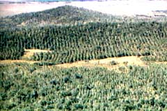 位于松岭区南部,属加格达奇林业局管辖。为人工更新造林,主要树种为落叶松,通过调查设计、整地、植苗、抚育补植,生长状态良好,有部分树木已基本成材,由于是人工进行抚育,树木排列整齐,远望如同梯田一样,非常壮观。林中现已使生态环境进入良性循环,林内有狍子等野生动物栖居,主要病虫害为松毛虫、鼠害等。