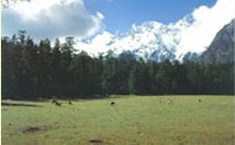 云杉坪是玉龙山东麓的约一平方多公里的一片草甸,雪山屏立一侧,周围以千年的云杉林所怀抱,坪内芳草萋萋,牧歌悠扬