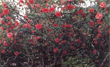这株山茶,有几个特点:一是花开万朵,花期长。每年立春初放,立夏花尽, 7个节令共100 多天中,先后分20余批开放,一批未蔫而一批又含苞待放,每批干余朵,总共要开2万余朵,每朵有5~7寸盘子那么大。“万朵山茶”,因此得名。二是立地可赏。一般的方山茶,多为树千高疏,宜远观,不宜近赏,远望一树红,近看凌云中;玉峰山茶,主干虽有水桶般粗细,却仅3米多高,其茂盛的枝干不是冲天凌空,而是被园艺师精心培育,巧妙地编织成三坊一盖、两丈见方的花棚。步入庭院,花枝拂袖牵衣,花朵在眼前头上竟相开放,人在花树旁,花在人群中,令人目眩神迷。三是鸳鸯并列,赏花人若是细心,就会发现树若一棵,花开两样,一种是“九蕊十八瓣”,酥嫩艳莹,每朵花都有七寸盘大;另一种是“单蕊山花”,喷雪吐焰,花朵只有五寸盘大,有的单花缀枝,有的并蒂开放,枝条交错,难解难分,令人惊奇。原来,这是两株不同品种的山茶并肩长在一起,天长日久,变得密不可分,俨然是一株了。