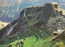 古石城远望像一朵秀拔的灵芝,以她特殊的姿态,屹立在葱翠的千山万壑中,城堡四周叠满梯田,春夏绿波荡漾,秋来金浪卷云。