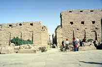 阿斯旺大坝看起来象是铺在大湖上面的一条宽广的公路。大坝两侧除了无边的水面外,还有很多水利设施,这样工业化的场面在埃及是不多见的。大坝上有水库平面图及说明。弧形拱桥式的大坝,高111米,长3830米,宽40米,将尼罗河拦腰截断,从而使河水向上回流,形成面积达5120平方公里、蓄水量达1640亿立方米的人工湖—纳赛尔湖。远处是莲花状的大坝建成纪念碑,伴着平静的湖水,我们已无法感受到当年水利工程施工时的浩大场面了。