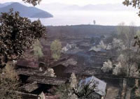 云南旅游景区泸沽湖沿湖村落棋布,民房建筑风格奇特,大多为方木垛成的井干式木楞子房,以木板当瓦,每块长约、1米,宽0.17至0.26米不等。内部结构为适应其母系原则而组成家庭特点,有火塘所在的正室,为全家的中心。旁有老人及未成年孩子住的地方;另一幢二层楼房为“客房”,上为青壮年妇女与他们的“阿注”的居室,保留着母系氏族公社时期的一些特点(昆明国旅网)。
