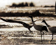 秋冬来临,草原一片金黄、远山如黛、皑皑白雪峰倒影与湖泊中,这一季节,黑颈鹤、黄鸭、班头雁云集于此,在草丛中、水面上嬉戏漫游,使广阔空灵的草原另具一番诗情画意。藏族人民热爱飞禽、从不伤害它们,特别是黑颈鹤,千百年来得到了藏族人民的保护,与人十分亲近,常在村舍旁、帐逢边落脚过夜,与人畜共处、惹人喜爱。