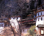 在迪庆州维西县其宗象鼻山下西望,有一座山俨然一尊巨大佛祖端坐于云天之间,这就是达摩山,距其宗仅6km,由山脚攀登,可直抵达摩祖师洞寺。“极目悬崖万丈高,巍峨古寺接云霄”,祖师洞前一座庄严寺院赫然在目,红墙黄瓦,金碧辉煌。 达摩寺属噶举派寺院,建于清康熙元年(1662年)。寺院建在海拔3000米的悬崖峭壁上。相传达摩祖师曾云游到此,在此山洞内面壁十年而得道成佛。至今洞中石壁上还印有当年祖师面壁时形成的影像,洞前石板上有一对深深的脚印,相传是当年祖师得道后“顿石成洼”留下的圣迹。山洞因此而得名。洞高30米,深10米。寺院是依壁叠木,依洞造型,凿石架木而成,形成石洞与僧房互为一体的奇特景观。与山下分列左右的来远寺和达摩寺遥遥相望,成三足鼎立、互为倚角之势,成为远近闻名的佛教圣地。l984年后将山下原属止贡噶举派的来远寺以及原属噶玛噶举派的达摩寺两寺的僧侣合并于此活动 。其大经堂中供奉释迦牟尼、莲花生祖师 、格鲁派创始人宗喀巴以及止贡噶玛噶举两派祖师的造像,并珍藏有相传是达摩祖师“顿足成洼”的圣迹以及达摩祖师及其弟子的遗物灵塔。有僧侣近80人。