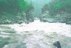 盈江虎跳石、落水洞位于盈江县城34公里的坝尾山边,数百来宽的大盈江流到这里一下子收束成了七、八米,两岸两座冲天而立的石壁象两扇半开的巨门,封住了大江的去路,狂怒的江水拍打着江中峥嵘的乱石,激起冲天的水柱和水花,发出雷霆般的轰鸣,翻卷着穿过石壁,像是要把一切都摧毁,给人一种气势磅礴,吞天化地之感。屹立于江中的两块巨石就叫虎跳石。