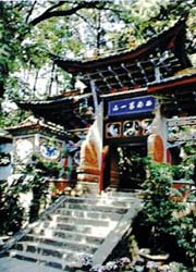 跨进狮山之间,在茂密的常绿阔叶林中,迎面便是一座森严而壮观的佛寺,现名正续禅寺。正续禅寺建于元代至大四年(公元1331年)是为正寺;后经印度名僧指空扩建,是为续寺。寺内大雄宝殿雄伟耸立,周围的亭院以及楼台亭阁,布局巧妙,工艺精湛,遍布于其间的各种碑刻、楹联出自历代名家之手,有着丰富的文化内涵。在大雄宝殿前,生长着数株古松柏,据说已有上千年的历史,更为这座古刹增添了神秘的色彩。寺院的扩建者指空禅师系印度有名高僧,在滇中地区享有极高声望,他选中狮山作为传教圣地,并对寺院进行了匠心独具的扩建,使得这座滇中古刹,顿时生辉不少。后来,指空辗转去了韩国,传播佛教,开宗立派,至今仍受韩国人民的顶礼膜拜。