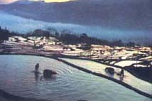 元阳梯田素有"甲天下"之美称.县境内36万多亩梯田遍部山山岭岭,其气势之磅礴,面积之广阔,堪称世界一绝.日出时,红霞满天,云雾滚动,婆娑竹影,身临其境如入世外桃园;满坡的梯田,波光粼粼,金灿灿,亮闪闪,好似一架架直上云霄的天梯,好一派美不胜收的壮丽景色;日落时,山村,树林,牧童披着金黄的沙巾,千山万壑,如诗如画,让人赞不绝口----江山竞如此多娇.