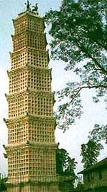 据该县县志记载, 原名金鸡塔,始建于元代,以后历代都曾修葺。塔身为砖砌,呈六角形,共7层,高18米。塔基以上塔身逐层收缩,并密布窗格样的佛龛1691个,每个龛内供奉陶制佛像1尊,故又名千佛塔。塔顶覆铜锅1口, 塔尖置石雕葫芦1具,并立有铁铸金鸡2只。千佛塔的建造,寄托着古代人民的良好愿望。这其中,有着一个传说,从前,这个县由于南盘江贯穿全境,淫雨季节,波涛汹涌,江水肆虐, 破圩决堤,泛滥成灾。当时,人们认为这灾难是桀螯不驯的鳌鱼兴风作浪。于是,建此塔以镇鳌鱼,又在 塔尖置两只金鸡监视。寺内大雄宝殿,高17米,五开间,重檐歇山顶,抬梁式木构架,有较突出的明代建筑风格。