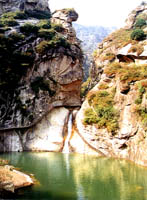 进入黑龙潭自然风景区,两峰耸峙,一水高悬,坐椅似的瀑布下面,就是碧绿得象翡翠一样的黑龙头潭。从黑龙潭攀登而上,向前半公里之遥,悬潭、沉潭就出现在面前。过了悬潭,往里走200米,隐约听到潺潺溪水声,峰回路转,“通天瀑”立即出现在眼前。站在大瀑下面,清亮的溪水好象从天而降,跌下刀削般的峭壁,腾起袅袅水雾,激起银色水浪好象朵朵盛开的白牡丹。“通天瀑”下面是落雁潭,秋风萧瑟,落叶飘飞,南飞的大雁也迷恋这里醉人的景色,常常落下来在这里歇脚。继续上行“平沙潭、龙门口、龙劈石、刺猬石、龙卷身、珍珠串、无底潭”等景观相接,令人称奇叫绝。