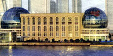 坐落在浦东陆家嘴东方明珠广播电视塔旁。从外滩隔江相望国际会议中心,只见乳白色的外墙轻轻地托起两只巨大的球体。大球直径50米,高51米;小球直径也是50米,但高只有38米,一大一小,相映成趣。球体上的透明玻璃拼装出世界地图图形,意寓“上海走向世界”。上海国际会议中心的外墙总面积达25860平方米,采用了微晶银幕墙、花岗石幕墙、金属铝板幕墙、破璃幕墙等外墙材料,显得凝重高雅。外墙上安装的25只、每只约8吨重的石柱帽更突出建筑物的雄伟壮观。