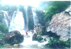 ?obsp; 九里飞瀑位于九里沟1公里处的河床绝壁上。瀑面宽达26.9米,最大落差38.9米,数股激流从断崖绝壁处倾泻而下,喷珠?玈,声若龙吟,响遏幽谷,兼雾气升腾,景色十分壮观。更为奇特的是每当丽日晴空,午后3-5时置身瀑布下,举目西望,彩虹光环夺目,异彩纷呈,且时有灵光隐现,亦神亦幻。令人愉悦无穷,遐想无尽。