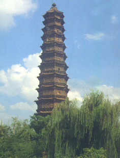 铁塔是宋代著名佛寺开宝寺为供奉阿育王佛舍利而建立,属于佛塔。宋太宗赵光义时,吴越王钱鏐的孙子钱俶,将佛舍利磅到北宋国都东京开封,宋太宗祈佛祖保佑免灾祛疫,在开宝寺中把佛舍利埋于地下,并命大建筑家喻浩建筑木塔。塔建在开宝寺西隅福胜禅院,呈八角十三层,高约129米,塔身稍向西北倾斜,定名为福胜塔。木塔始建于宋太平兴国七年(982年),竣工于端拱二年(989年)历经七年建成。宋庆历四年(1044年)遭雷电袭击焚毁。