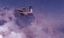 蓬莱阁:位于蓬莱县城北的丹崖山巅。下临大海,殿阁凌空,云烟缭绕,素称“仙境”。与黄鹤楼、岳阳楼、滕王阁并称我国四大名楼。传说蓬莱、方丈、瀛州为海上三仙山,神话“八仙过海”也在这里。