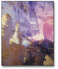 从洞口沿隧道斜下去六十多米,首先进入“飞瀑大厅”。厅高五十五米,宽五十米,长八十米,可纳千人。厅的南端和西北各有一小洞“玉柱擎天洞”和 “神仙洞”。“雪花洞”中的钟乳石瑰丽多姿,造型奇特,一步一景,景景不同。有的象天女散花,有的如群星拜寿,有的似海底珊瑚,有的若古刹宝塔……,极造化之神巧,令人目不暇接。加上洞中有洞,曲径通幽,恍若迷宫,更使人有扑朔迷离之感。据地质部门初步考察,雪花洞的形成距今有数万年的历史。